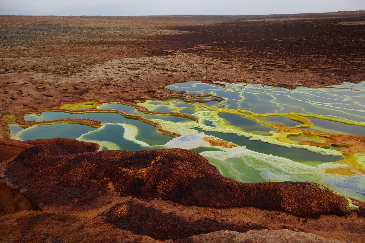 O deserto de Danakil, na Etiópia, é um dos lugares mais quentes e hostis da Terra. Lá você encontrará uma paisagem marciana com fontes termais coloridas, lagos de lava e salinas. Além disso, o Deserto de Danakil abriga o vulcão ativo de lava Erta Ale, que oferece uma vista espetacular da lava brilhante à noite.