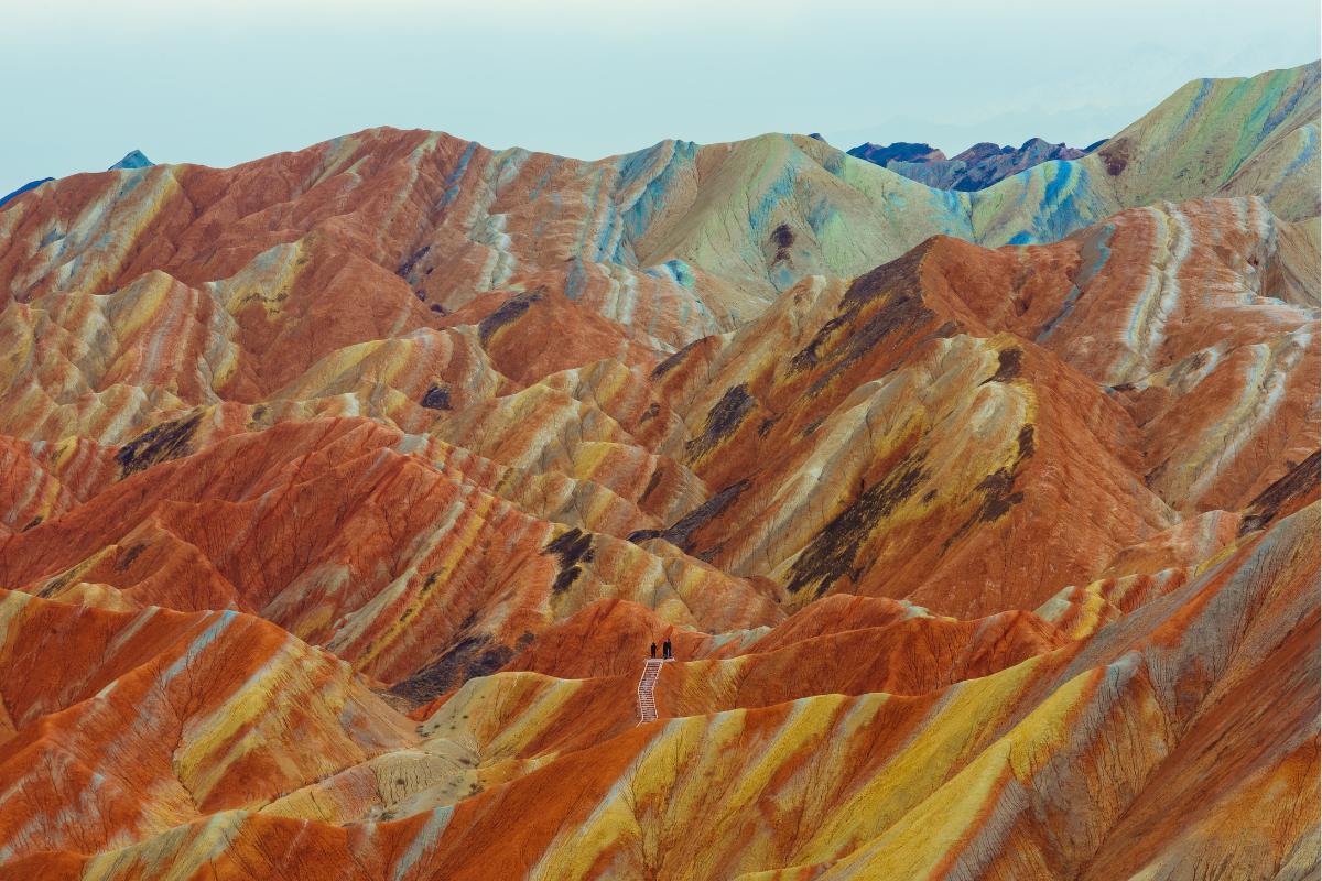 O Parque Nacional Zhangye Danxia, localizado na província de Gansu, na China, é famoso por suas montanhas de cores vibrantes e formatos incomuns. A erosão e os processos geológicos ao longo de milhões de anos criaram paisagens multicoloridas que parecem saídas de um conto de fadas. Os tons de vermelho, amarelo, laranja e verde dessas montanhas criam uma visão surreal e única.