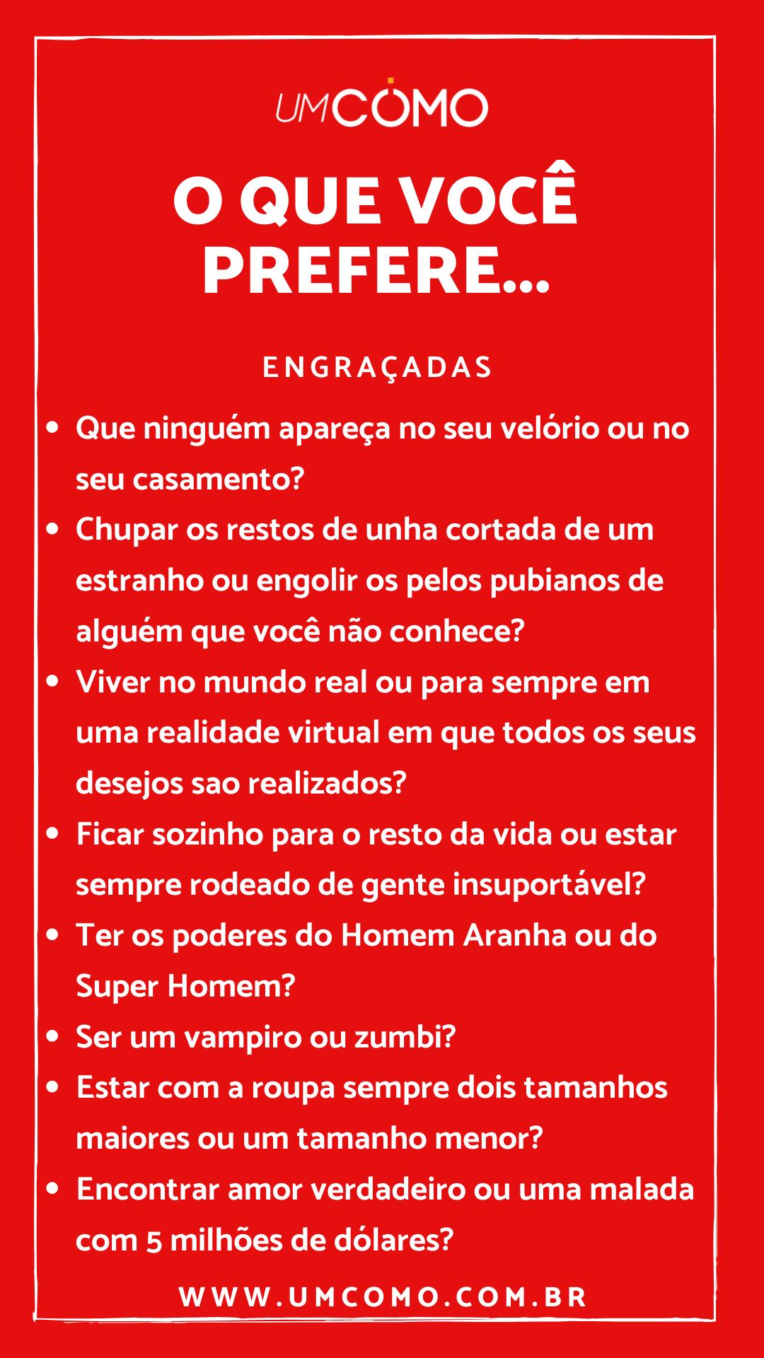 As questões do tipo 'você prefere' já têm uma natureza engraçada. Mas algumas são especialmente hilárias e arrancam risadas bem antes da resposta. Vale lembrar que você sempre começa perguntando assim: