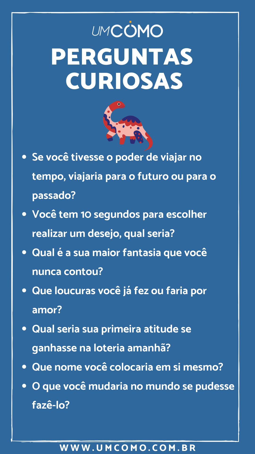 Fazer perguntas curiosas ou até irracionais pode ser um jeito de desenvolver a inteligência, além de passatempo divertido para aproveitar com a família, os amigos ou o parceiro (a). Se você já passou por isso alguma vez, fazer da situação um jogo só será positivo: nem sempre são necessárias respostas concretas, e a verdade é que às vezes é impossível encontrá-las. Se você estiver interessado em se aprofundar sobre esse tema, recomendamos que siga lendo esse artigo do umCOMO, que traz 60 perguntas curiosas com resposta.