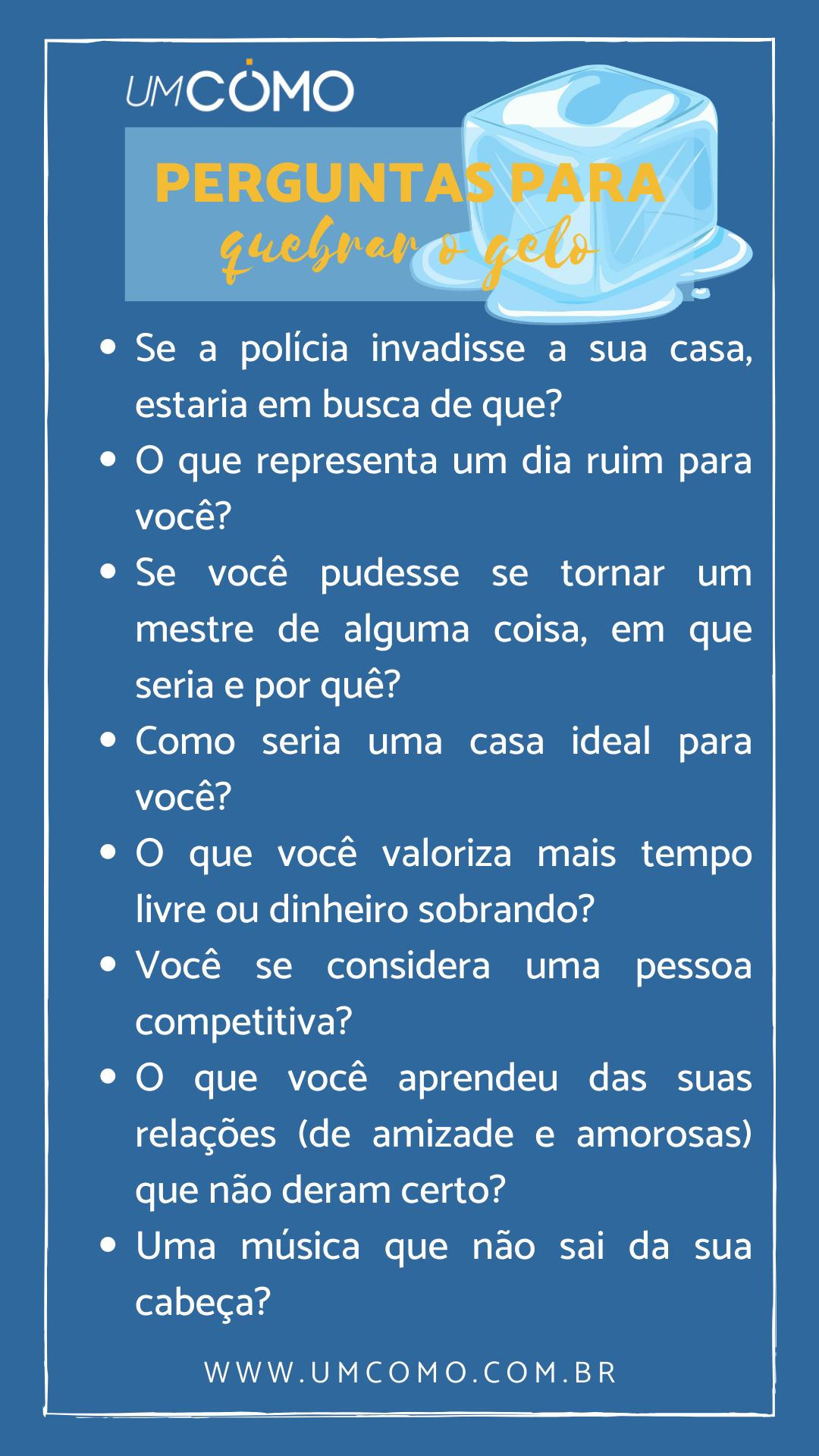 Nós somos seres sociais e, por isso, é sempre bom ter na manga aquelas perguntas capazes de iniciar uma conversa e quebrar o silêncio, muitas vezes, constrangedor. Se você vai passar por uma situação assim ou, simplesmente, quer conhecer perguntas quebra-gelo para ter um bom repertório para os momentos em que elas se fizerem necessárias, continue lendo este artigo do umCOMO.