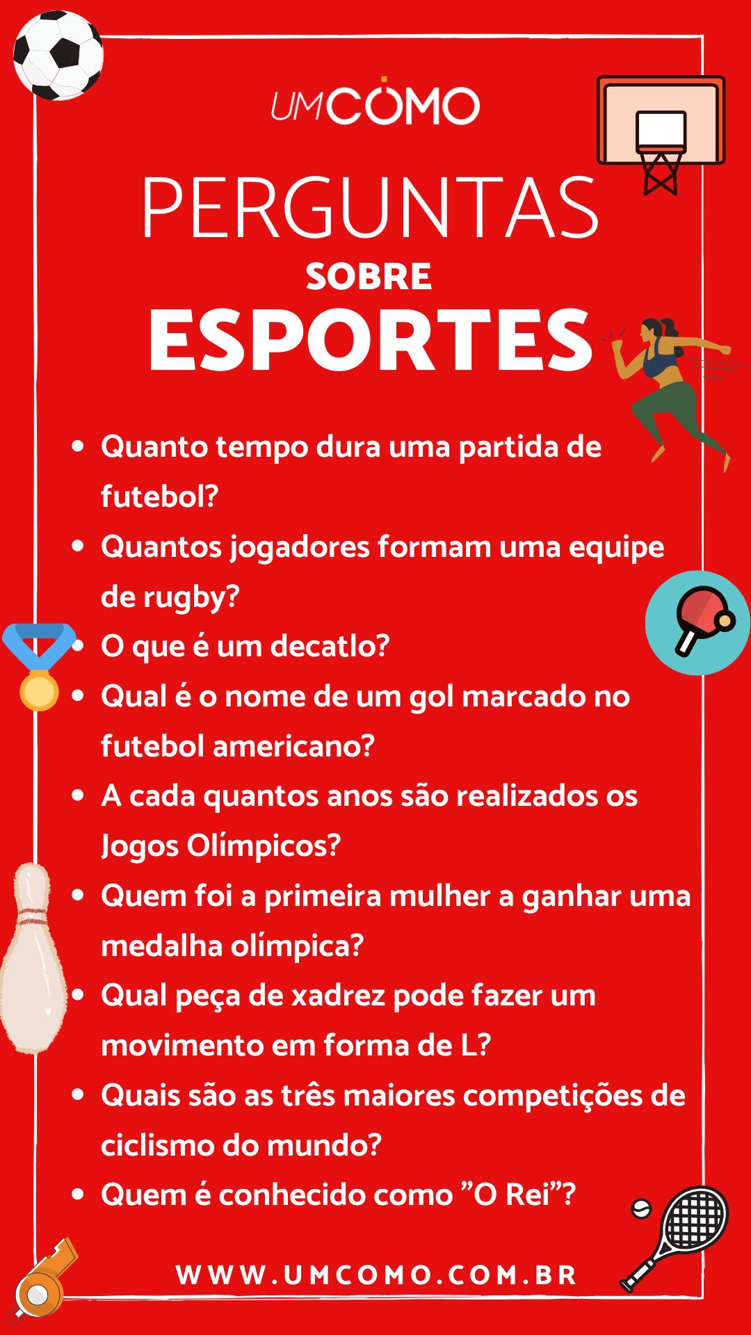 Se você quer ainda mais ideias de perguntas sobre esportes, aqui está outra seleção para você. A seguir, veja algumas perguntas e respostas sobre esportes e saúde. Conte quantas você consegue acertar!