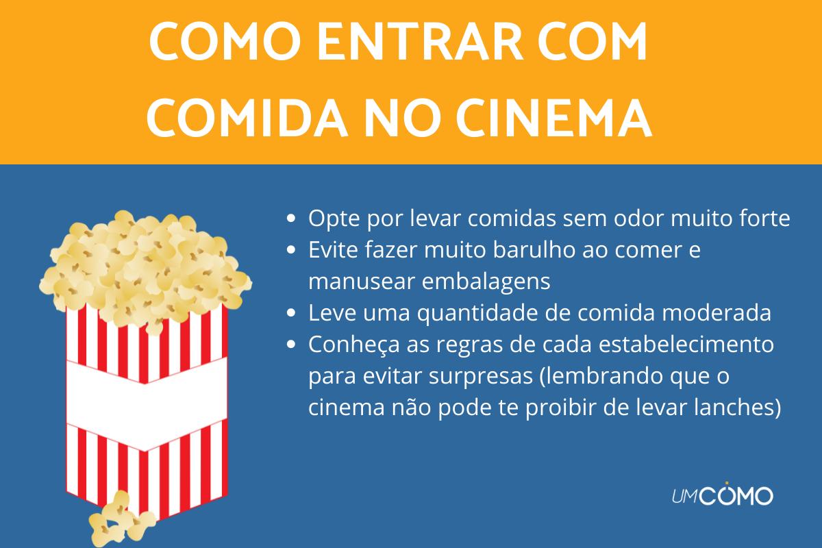 Além disso, se estiver em dúvida sobre entrar ou não com comida no cinema, vale questionar o estabelecimento de antemão para evitar problemas na hora H e ser pego de surpresa. E se for impedido de entrar para assistir ao filme com comida que não tenha sido comprada na bomboniere do cinema, não deixe de conversar com o gerente para contornar a situação e explicar seus direitos. Se mesmo assim não funcionar, converse com o Procon da sua cidade.