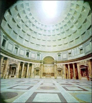 O Panteão foi construído por Agrippa no ano 27 A.C. Foi um templo que homenageava todos os deuses. Têm uma série de aberturas e fechamentos, foi em 608 que se tornou num igreja dedicada a Santa Maria e aos Mártires. Tem um buraco no tecto por onde entra a luz.